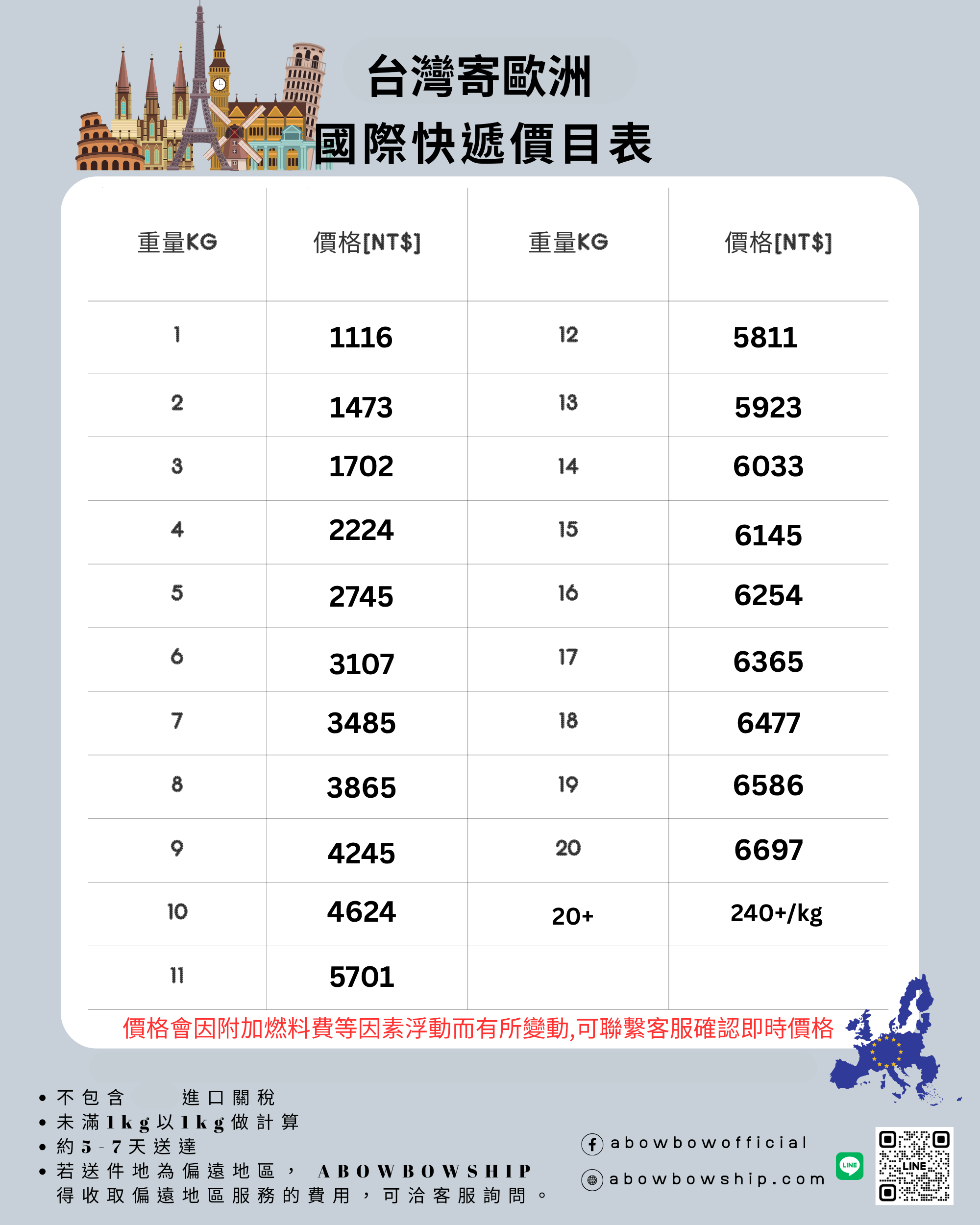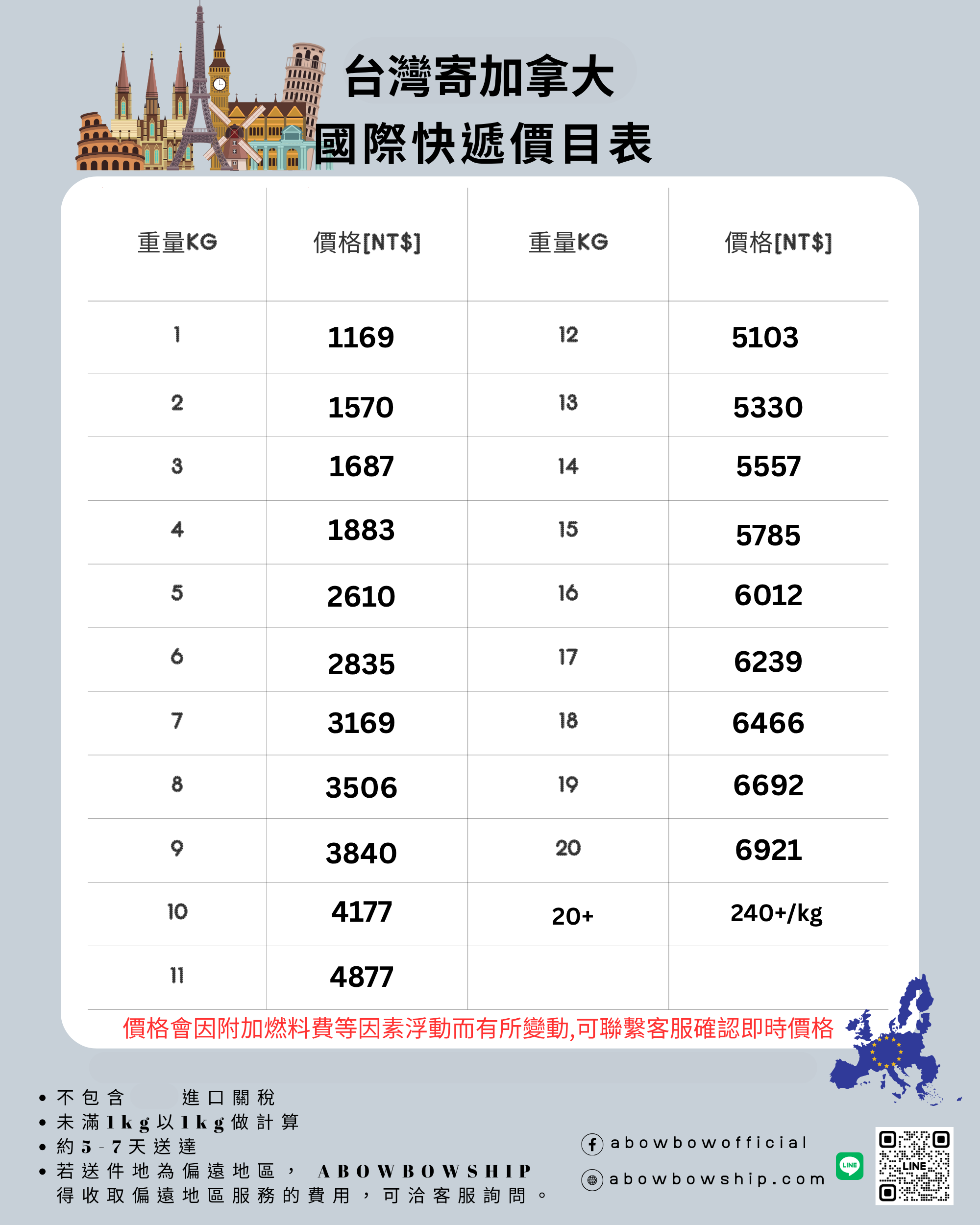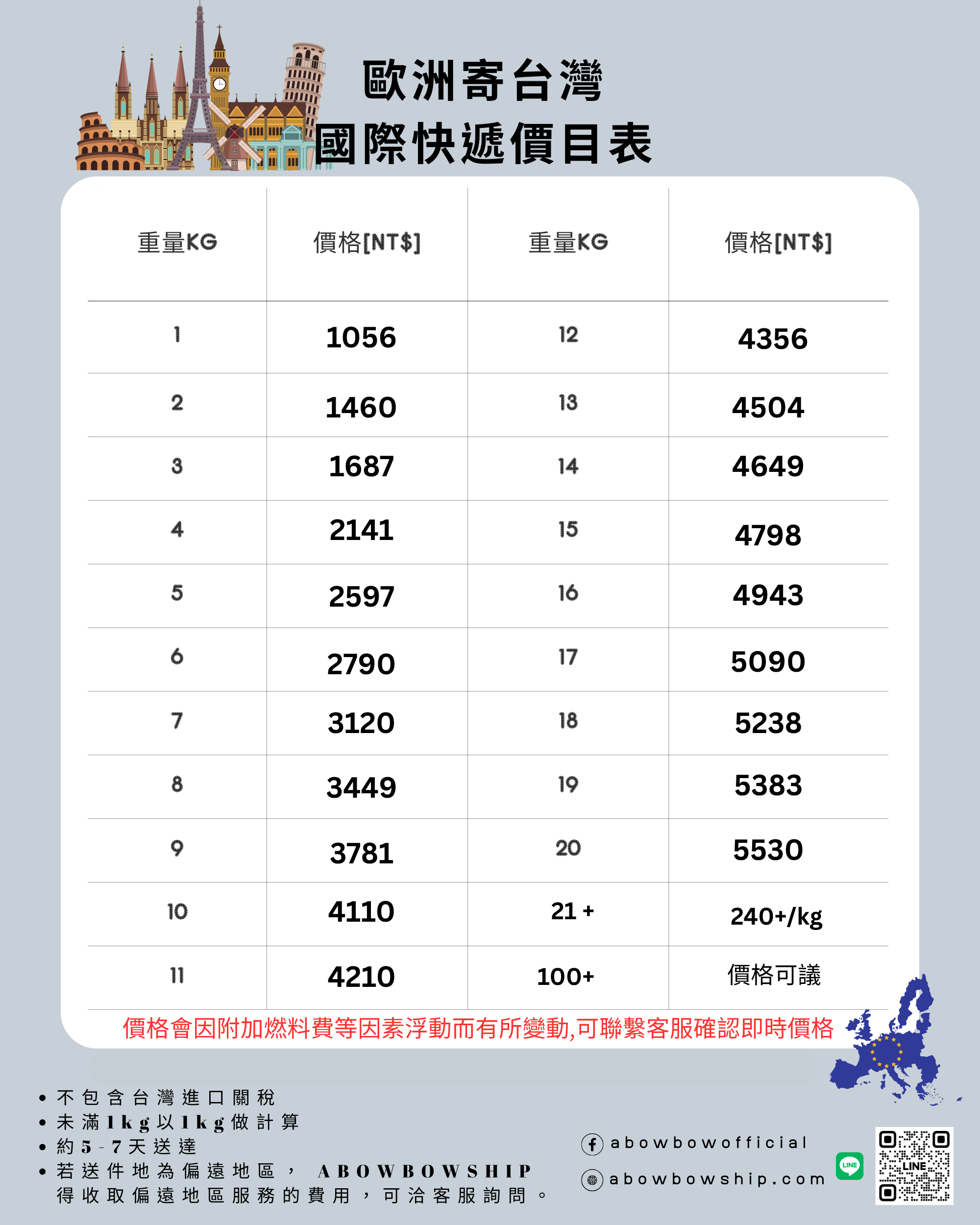 以下皆為到A國到府收件直寄B國的費用表,僅提供參考用